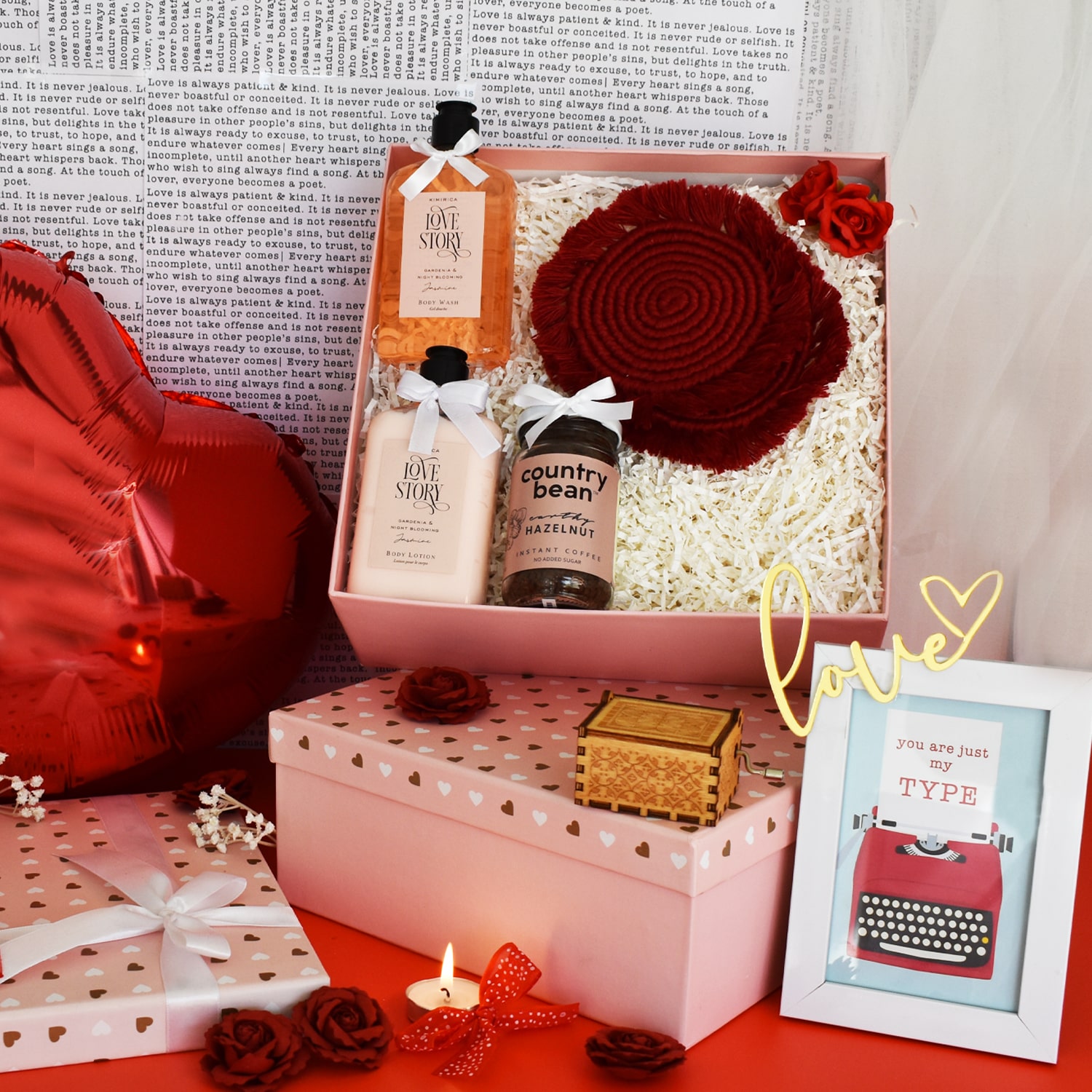 Your special moments, your bond, your good days, remember it all this Valentine’s Day with our Love Story Gift Box. It’s got the cutest gifts. There’s a Love Story lotion and shower gel by Kimirica, a music box to listen to the most romantic songs telling your beautiful love story, a personalized mini frame to put your fav couple photo in, and a yum jar of coffee.