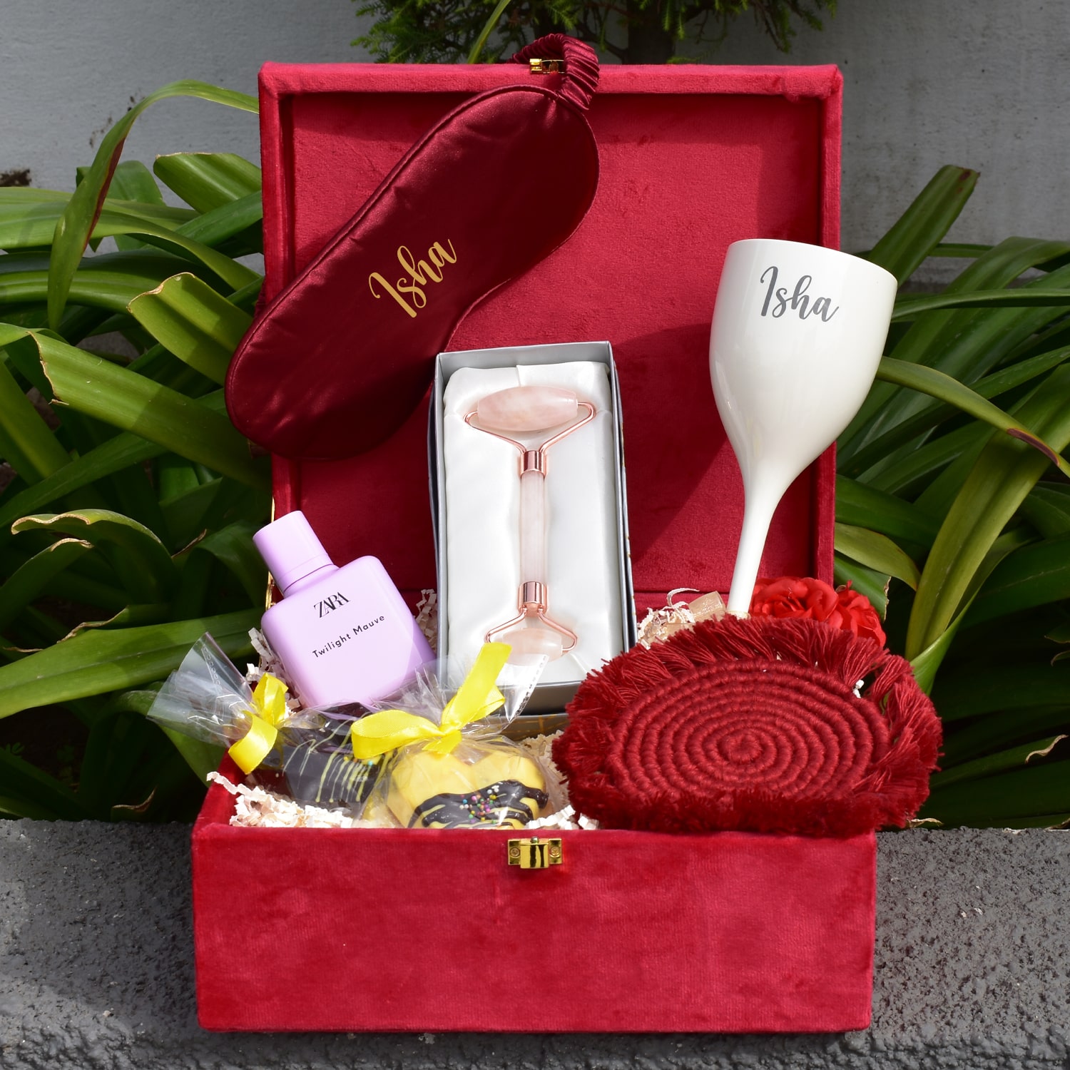 It’s filled with distinct gifts like a fantastic face roller, a stunning handcrafted macrame coaster, a beautifully fragrant perfume by Zara, a unique personalized silk eye mask, yummiest pinata chocolates, and the most special of all, a personalized wine glass for them to sip their most favorite wine in (oh and…wait for it…it’s unbreakable! So, if your wife or girlfriend has butterfingers, then they’re sorted!).